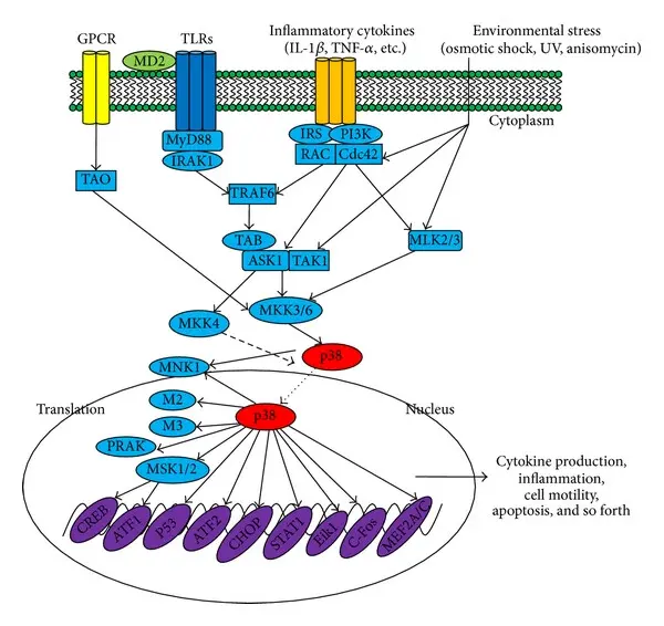 The p38 MAPK pathway belongs to the broader family of MAP kinases, which also includes ERK and JNK pathways. Unlike ERK, which is primarily associated with mitogenic signals, p38 is predominantly activated in response to cellular stress.